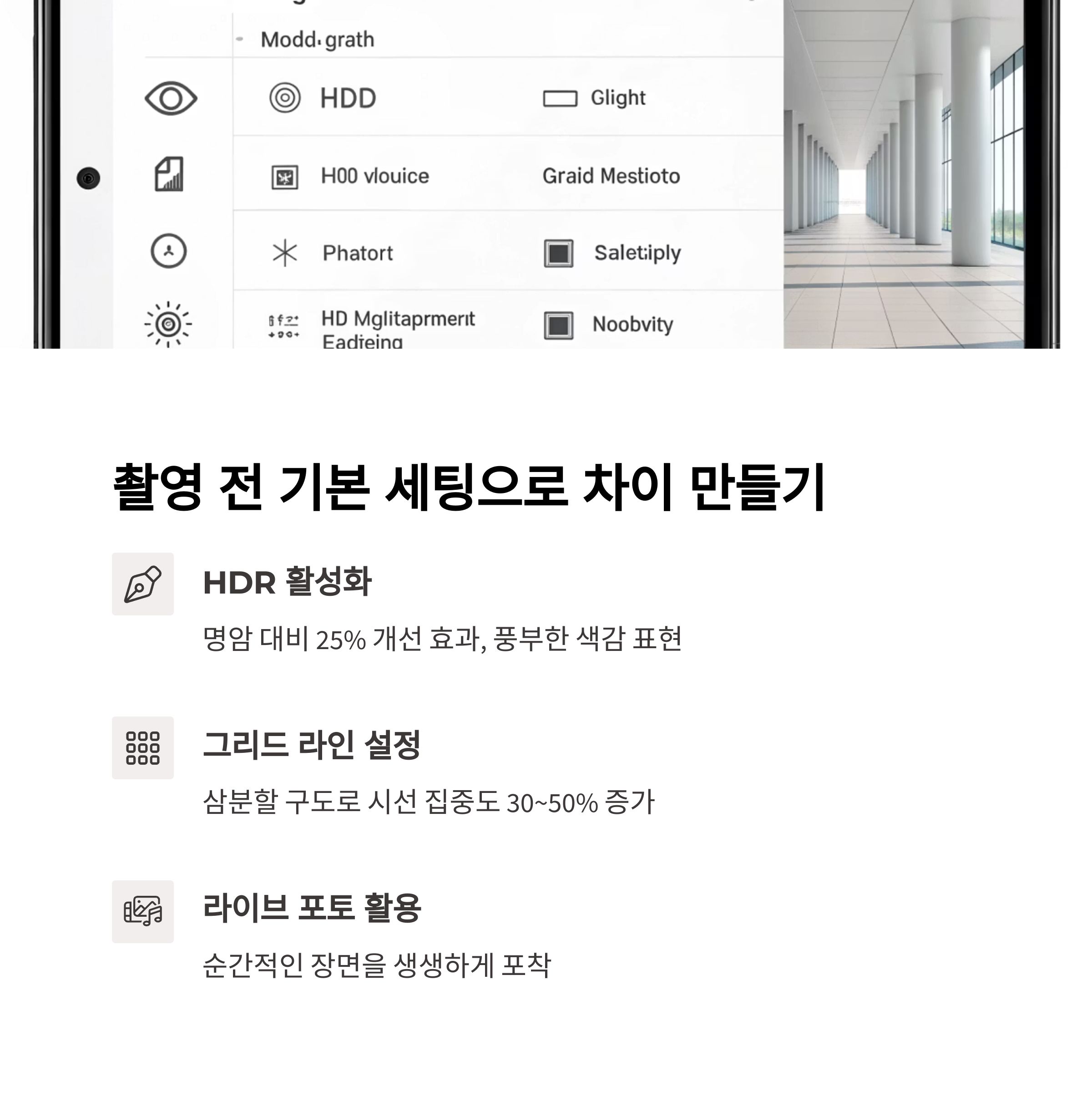 HDR, 삼분할 구도, 프로모드와 같은 기능들은 촬영 퀄리티를 높이기 위한 기본 요소입니다.